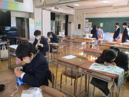 6組家庭科 刺し子の袋づくり、生姜焼きと野菜炒め