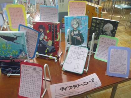図書室では司書の先生がきれいに本をレイアウト。読書好きな図書委員の皆さんのおすすめの本も楽しそうですね。