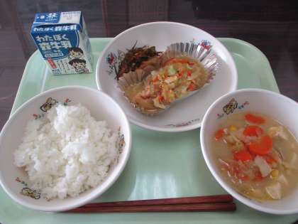 昆布のつくだ煮、鮭のちゃんちゃん焼き、どさんこ汁、ごはん、牛乳のおいしい和食です。11月は「和食月間」、今日も日本が古くから料理に使っている「だし」を用いたおいしい食事です。だしのおいしさは「うまみ成分」。外国でも「UMAMI」と呼ばれているそうです。