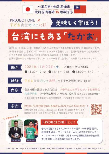 2021年11月は、台湾にある 高雄市 と私たちが住む「八王子市」の 友好交流都市 15周年になります。15周年を記念し、台湾料理を食べて台湾を知る 《 子ども食堂(施設内飲食/持ち帰り不可/食品配布なし)》を11/27(土)に開催します。