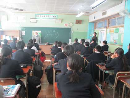 2年 戦争体験者の方からのお話。生徒の皆さんも真剣な表情です。