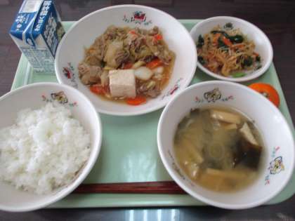 豚すき焼き風煮、小松菜と切り干し大根のお浸し、里芋のみそ汁、ごはん、みかんのおいしい和食です。