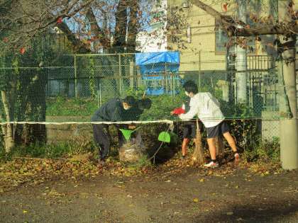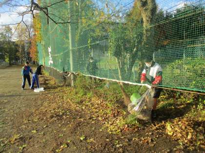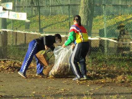 ソフトテニス部が校門付近の落ち葉掃き、そしてさわやかな挨拶をしてくれてています。
