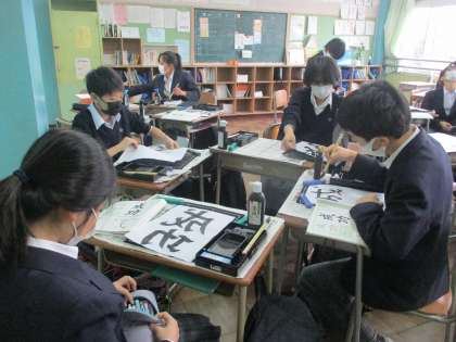 1年国語 書道。仲間の作品に刺激を受けながら・・・。廊下に掲示しますので、3者面談の際に保護者の皆様もご覧ください。