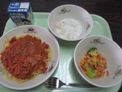 大人気メニューのスパゲティミートソース、和風サラダ、ピーチヨーグルト、牛乳の栄養たっぷりの給食です。