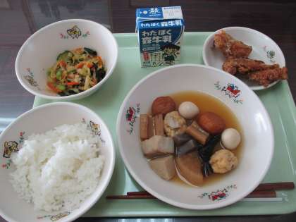 鶏肉のから揚げ、わかめサラダ、おでん、ごはん、牛乳の生徒が大好きなメニューです。