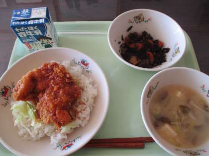 School Lunch 公開日 2021/12/21 更新日 2021/12/21 学校の様子 かつ丼、じゃがいもとヒジキの煮物、いもがらの味噌汁、牛乳の、「かつ」が大きくて肉好きにはたまらない給食です。 いいね(0)
