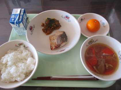 ほっけ、かぼちゃ、みそ汁、ごはん、ミカン、牛乳のヘルシーな和食です。