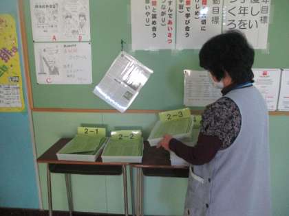 健康カードチェック 安全・安心のためのカードのチェックを上原先生が毎日行っています。保護者の皆様のご協力にも感謝しております。
