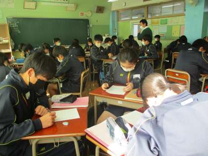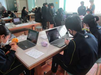 1年家庭科 動画で編み方を確認しながらコツコツと仕上げていました。
