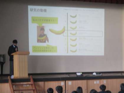 式終了後はソフトテニス部の表彰、八王子市の理科コンクールの校内優秀者、市の表彰者と市奨励賞を受賞した生徒によるプレゼンテーションを行いました。実験結果をもとに本校生徒や職員にもおいしくバナナを食べてもらいたいと思います。