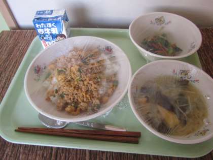 とりそぼろの炒り卵丼、青菜のからしあえ、里いも入りみそしる、ごはん、牛乳です。