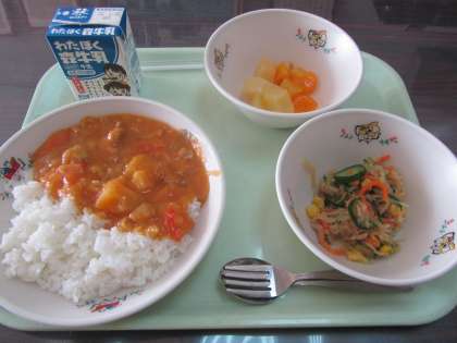 チキンカレーライス、ツナと大根のサラダ、フルーツ缶、牛乳のおいしいメニューです。