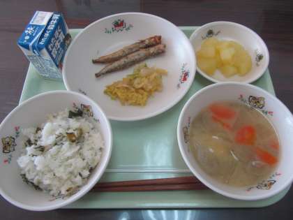 じゃこ菜めし、ししゃもの香り揚げ、ピリ辛白菜、田舎汁、りんご缶、牛乳のおいしい和食です。