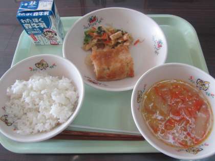 和風ミートローフおろしソースかけ、小松菜と油揚げの煮びたし、白菜とコーンのスープ、ごはん、牛乳のおいしい和食です。