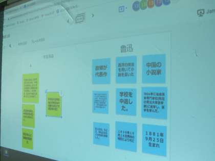 3年国語 「学び合い×ICT」。時代背景をふまえて理解する必要がある文学作品では、一人一台のタブレットで調べて班でまとめて、全体で共有。まとめかたも班の個性が表れました。