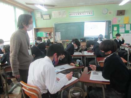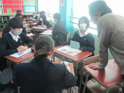2年理科 「台風の通過時の気象の変化」。資料を見て気が付いたことをダイアモンド型班で話し合う活動は2回短時間で、全体で共有の時は机を戻して・・・。感染症にも配慮した時間配分の中で、生徒の皆さんもメリハリをつけて仲良く学びを深めていました。