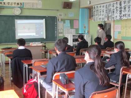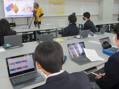 感染症予防のために、各教室にTeamsをつないで実施、知らない単語も多く出てきましたが、理解しようとよく頑張っていました。