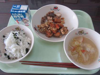 鮭の南部揚げ、芋の子汁、煮しめ、じゃこいりわかめごはん、牛乳のおいしい和食です。