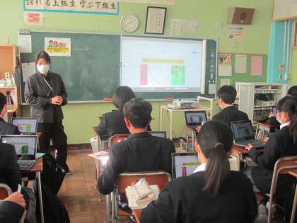 感染症対策のため、WEB配等で来校人数をしぼったうえ、離れて参観という形でしたが、成長した生徒の皆さんを小学校の先生に見ていただくことができました。