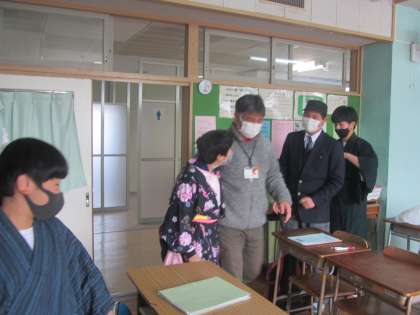 ここは寺子屋か・・・錯覚するほど着物になじんでいる生徒の皆さん。本番に向けてそれぞれの役の衣装に着替えていました。