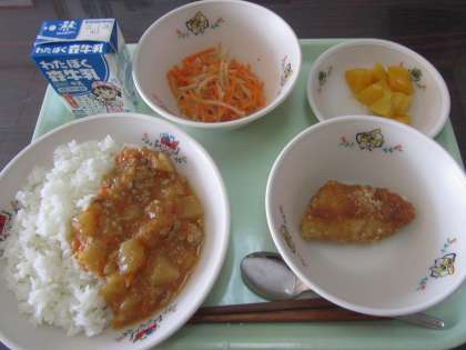白身魚の香り揚げ、マーボー大根、にんじんともやしのナムル、ごはん、黄桃缶の…和食?中華料理?韓国料理?いずれであっても、とてもおいしかったです。