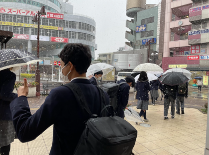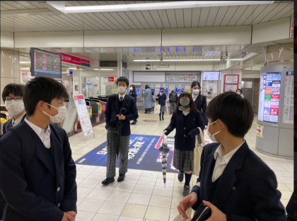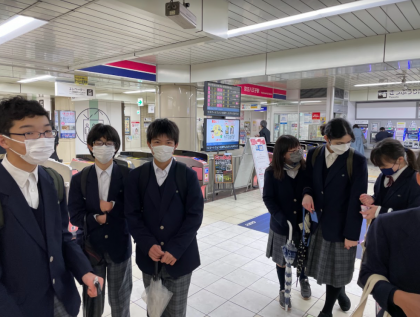 1学年フィールドワーク、雪降る中を協力し合い、無事に訪問先へ行ってきました。