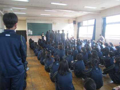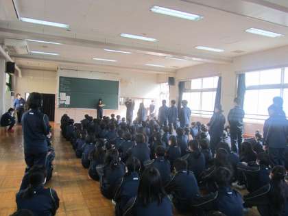 2年学年集会 今学期の振り返り。よく頑張った人の紹介がありました。昨日の校外学習の取組も素晴らしかったとのことです。
