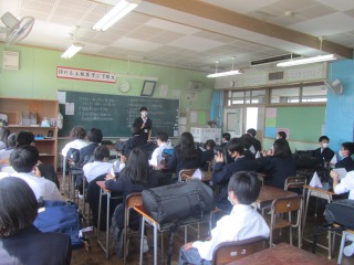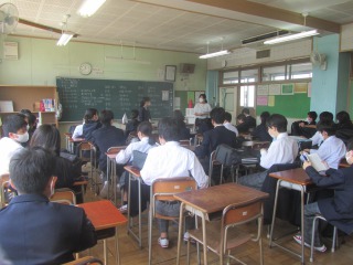 体育館で学習・評価説明会が終わって教室に戻ってほっとした様子の1年生、担任の先生の話によれば聞く態度が大変良かったそうです。