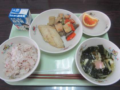 鰆の桜揚げ、筑前煮、春のすまし汁、ごはん、ブラッドオレンジのおいしくて、ピンクがきれいな和食です。