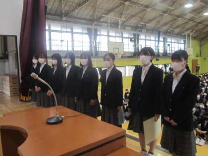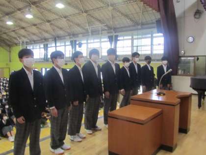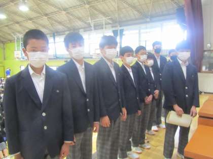 今朝は卓球部、野球部、バレーボール部の表彰を行いました。