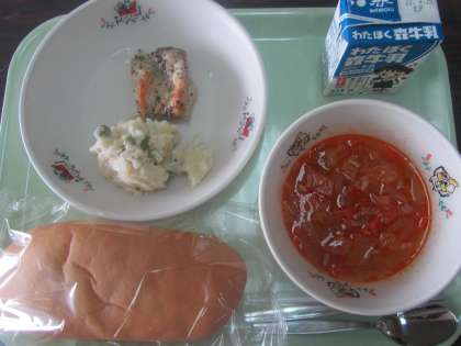 チキンのハーブ焼き、ポテト・グリンピースカルボナーラ・ミネストローネスープ、コッペパン、牛乳のおいしい洋食です。
