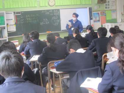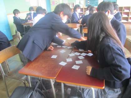 1年英語 先生の英語だけの指示をしっかり理解、全力で取り組む姿に感心しました。小学校から英語に触れてきたことがよくわかります。