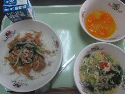 給食 ビビンバ、チンゲンサイと卵のスープ、オレンジポンチ、牛乳のおいしい給食を配膳員の方が運んでくださっています。