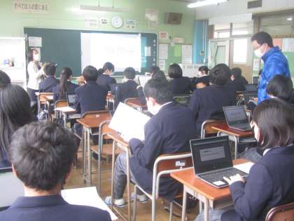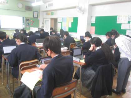3年進路学習 自分に合った上級学校などを、真剣な表情で調べていました。