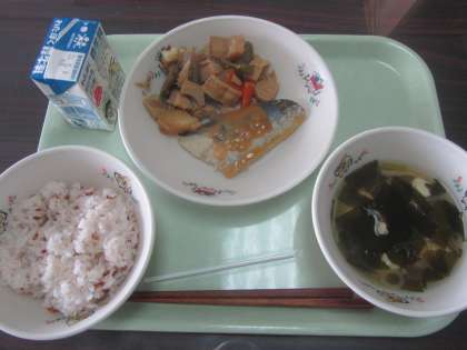 赤米ごはん、鰆のみそ焼き、タケノコの筑前煮、端午のすまし汁、牛乳のおいしい和食です。