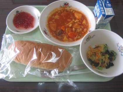 ポークビーンズ、わかめサラダ、コッペパン、手作り苺ジャム、牛乳のおいしい給食です。