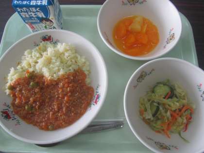 ドライカレー、イタリアンサラダ、オレンジポンチ、牛乳のおいしい給食です。
