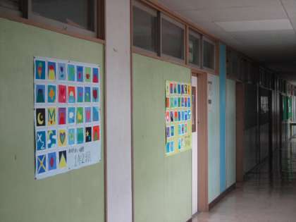1年美術 色の塗り方。できたての作品を先生が廊下に貼ってくれます。