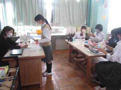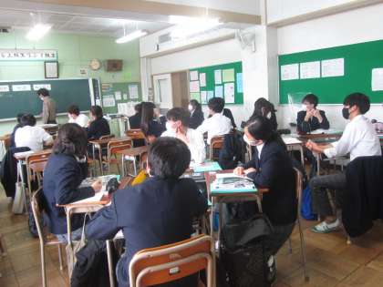 1年家庭科 ブックカバーづくりに向けて班での話し合いなど。