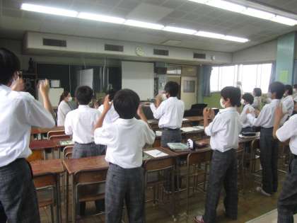 1年音楽 指揮をしながら校歌を元気に歌いました。副校長補佐の鈴木さんと一緒に鑑賞させていただきました。