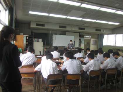 2年音楽 テスト返し。今日は大学生インターン(音楽専門)も来てくれています。