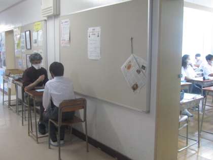 対話を聞いて答えを4つの選択肢から選らぶリスニング練習、教科書の文例を見ながら「わたしの夢」のスピーチ原稿づくり、ALTの先生によるパフォーマンステスト・・・と「聞く」「話す」「読む」「書く」の4技能をバランスよく学習していました。授業支援のインターンも英語が得意な大学生です。