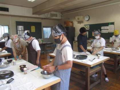 5組家庭科 ハンバーガー作り。手作りハンバーグが美味しそうです。