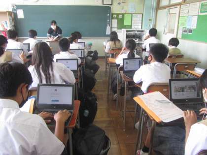 今朝の朝学習は2年生はミライシードで国語、1年生はデジタル教科書を使った英語音読です。英語の音読は野球に例えるのであれば「素振り」のようなものです。先生から習った方法で声をしっかり出して口の筋肉を鍛えて欲しいと思います。