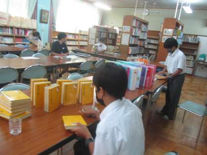 5組職場体験 司書のお仕事。図書館や古本屋さんで見る光景ですね。黙々と丁寧に磨いていました。