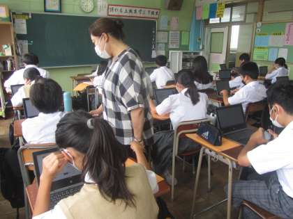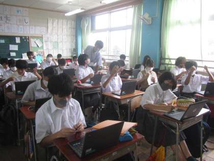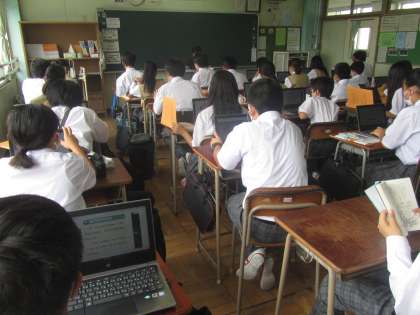 1年生の朝学習はデジタル教科書を用いた英語音読です。英語の先生と共に学年の先生が教科の壁を越えて支援してくれていました。前回よりタブレットPCの操作に慣れてきて、声も聞こえるようになってきました。「使える英語力の育成」「都スピーキングテストへの対応」のために早いうちから英語を口から出すことへの抵抗感を軽減していって欲しいと思います。