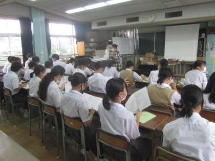 1年家庭科 手縫いの拡大投影に集中する生徒の皆さん。