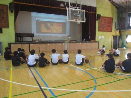 体育館では、バスケットボール部が映像を見ながらコツを学んでいました。