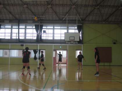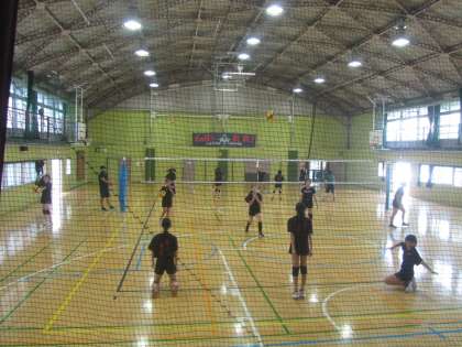 体育館で、素敵なあいさつと笑顔のバレーボール部の皆さんが、スポーツ万能の先生たちと練習していました。